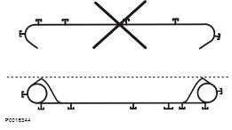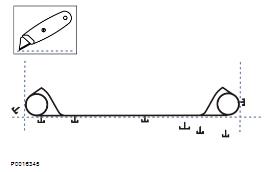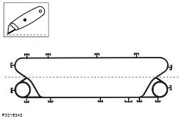 5   密封件必須使用沃爾沃遍達(dá)零件號(hào) 1161277 膠合。在兩半密封件相遇地方的上面和下面涂抹一層膠水。在圖示點(diǎn)涂抹膠水。擦去多余的膠水。安裝前等待 30 分鐘以上,以讓膠水干燥