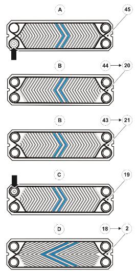 volvo沃爾沃冷卻板和安裝順序45 個(gè)板可供選擇P0016342A1 個(gè)底板(45)。圖案指向右邊。記錄已密封孔的位置。注意 唯一獨(dú)特密封件。B13 個(gè)精細(xì)圖案冷卻板。必須轉(zhuǎn)到每另一個(gè)板上的圖案指向左邊。(44、42、40......20)。B12 個(gè)精細(xì)圖案冷卻板。必須轉(zhuǎn)到每另一個(gè)板上的圖案指向右邊。(43,41,39 ...21)C1 個(gè)中間板(#19)。圖案指向右邊。記錄已密封孔的位置。D9 個(gè)粗糙圖案冷卻板。