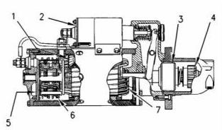 電磁閥(2)在空心氣缸周圍有繞組(一組或兩組)。彈簧加載的柱塞位于氣缸內(nèi)。柱塞可以前后移動。當(dāng)啟動開關(guān)閉合,電流通過繞組輸送時,產(chǎn)生磁場(1)。磁場(1)將柱塞在氣缸中向前拉。這會移動換檔桿,使小齒輪驅(qū)動齒輪與齒圈接合。然后,柱塞前端通過電磁閥(2)的蓄電池和馬達(dá)端子進(jìn)行接觸。接下來,起動馬達(dá)開始轉(zhuǎn)動發(fā)動機的飛輪。當(dāng)起動開關(guān)打開時,電流不再流過繞組。彈簧現(xiàn)在將柱塞推回到原始位置。同時,彈簧使小齒輪遠(yuǎn)離飛輪。