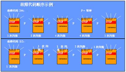可通過診斷開關(guān)或油門踏板進(jìn)入故障代碼閃爍模式。要進(jìn)入故障代碼閃爍模式,鑰匙開關(guān)必須處于ON(接通)位置并且發(fā)動(dòng)機(jī)停機(jī)。使用診斷開關(guān)進(jìn)入該模式時(shí),在診斷開關(guān)轉(zhuǎn)到ON位置后,ECM將自動(dòng)閃爍第一個(gè)故障代碼。診斷增加/減少將向前或向后調(diào)整現(xiàn)行故障代碼。要使用油門踏板進(jìn)入故障代碼閃爍模式,必須循環(huán)踩下和釋放油門踏板,使油門開度連續(xù)3次從0到100%。一旦進(jìn)入診斷模式,循環(huán)踩下和釋放油門踏板可順序向前達(dá)到現(xiàn)行故障代碼。下圖描述了通過停機(jī)指示燈指示的故障代碼閃爍方式的類型。
