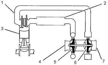 (1) 排氣岐管 (2)后冷器(3)發(fā)動機氣缸 (4)進氣口 (5)渦輪增壓器壓縮機葉輪(6)渦輪坩壓器堝輪葉鞋(7)排氣出口