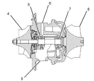 渦輪增壓器中的軸承(5)和軸承(7)使用發(fā)動機機油進行壓力潤滑。機油經(jīng)由進油管被輸送到上部的進油口(6)。機油繼而經(jīng)由中段內(nèi)的油遁潤荷軸承。機油從底部的出油口(9)流出。然后機油通過回油管流回曲軸箱。