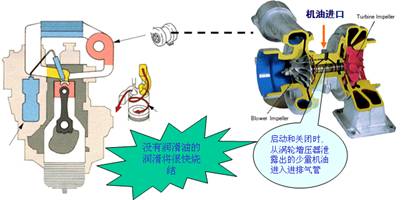 由于廢氣渦輪增壓器是依靠進(jìn)排氣的平衡壓力密封潤滑油的,因此,在啟動和關(guān)閉機(jī)器時(shí),總是要有少量的發(fā)動機(jī)機(jī)油漏出,這也是所有采用廢氣渦輪增壓器所具有的特點(diǎn).