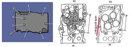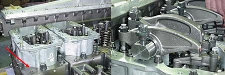 康明斯Cummins QSK23發(fā)動(dòng)機(jī)有7條螺栓擰緊缸蓋的燃燒室區(qū)域。這使得氣缸能密封200 Bar壓力并將缸套扭曲維持在最小。兩個(gè)小一點(diǎn)的缸蓋螺栓用于密封推桿腔。