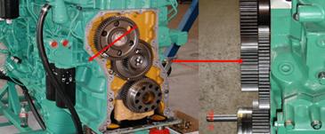 康明斯Cummins QSK23發(fā)動(dòng)機(jī)后齒輪系驅(qū)動(dòng)凸輪軸。 一個(gè)復(fù)合惰齒輪提供所需的速度降。這種布置提供了更小的噪音及更精確的噴油正時(shí)控制。
