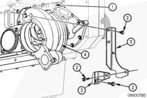 拆下將支架 (4) 固定到缸體上的兩個(gè)螺釘和重型墊圈 (6)。拆下將殼體 (2) 固定到水泵 (3) 上的四個(gè)螺釘。注意兩個(gè)墊圈 (5) 為重型墊圈。拆下支架。從泵上拉下殼體。拆下并廢棄 O 形圈 (1)。