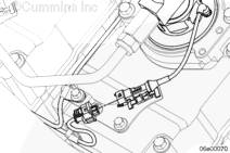 注: 如果發(fā)動(dòng)機(jī)配備 CM2150 ECM (1),用一塊不起毛的布蓋住螺塞。將高壓燃油管最后一個(gè)噴油器的螺塞松開(kāi) 1/4 至 1/2 圈。不必拆下螺塞以釋放壓力。連接 INSITE ™ 服務(wù)軟件,然后通過(guò)監(jiān)測(cè)燃油油軌壓力核實(shí)燃油壓力已下降。