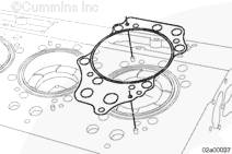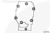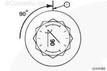 一個缸蓋上的所有螺栓(1 到 6 號)都擰緊到 217 N•m [160 ft-lb] 后,必須將這些螺栓沿擰緊的方向再轉(zhuǎn) 90 度。將螺栓擰緊至 217 N•m [160 ft-lb] 后,在缸蓋和 12 角螺栓頭上做標(biāo)記,以便為額外的轉(zhuǎn)動提供參考點。轉(zhuǎn)動螺栓,直到缸蓋上的指示標(biāo)記在第三和第四角頭之間。