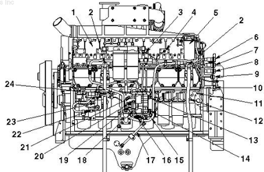 1進氣歧管,2曲軸箱呼吸器,3進氣歧管壓力傳感器,4進氣歧管溫度傳感器,5冷卻液濾清器,6 Inline 接頭 B,7 Inline 接頭 A,8 Inline 接頭 C,9數(shù)據(jù)通信接頭,10發(fā)動機轉(zhuǎn)速傳感器,11機油壓力檢查點(濾清器后面),12機油壓力檢查點(前濾清器),13燃油正時壓力傳感器,14燃油油軌壓力傳感器,15導線線束,16大氣壓力傳感器,17燃油油軌加濕軟管,18燃油油軌執(zhí)行器,19燃油切斷閥,20燃油溫度傳感器,21燃油正時執(zhí)行器,22燃油泵壓力傳感器,23燃油泵執(zhí)行器,24機油壓力傳感器,