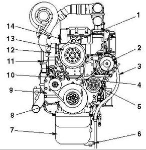 1發(fā)動機前吊耳,2充電機,3竄氣排出管,4冷卻風扇驅(qū)動皮帶,5驅(qū)動皮帶輪(用于充電機和制冷劑壓縮機),6機油排放閥,7油底殼,8減振器,9前齒輪室蓋,10冷卻風扇皮帶張緊器(僅限于工業(yè)用發(fā)動機),11冷卻液溫度傳感器,12節(jié)溫器殼體,13風扇轂總成,14發(fā)動機冷卻液出口,