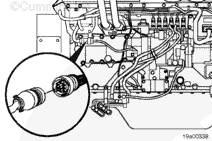 將車(chē)輛鑰匙開(kāi)關(guān)轉(zhuǎn)到斷開(kāi) (OFF) 位置。斷開(kāi) 9-針 Deutsch 噴油泵電氣接頭。不要斷開(kāi) 2-針 EHAB 裝置接頭