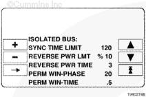 容許窗口時間 (PERM WIN-TIME):調(diào)整在 PowerCommand® 控制系統(tǒng)發(fā)出斷路器閉合信號前發(fā)電機組必須與系統(tǒng)母線保持同步的時間期限(單位:秒)??烧{(diào)整的范圍是 0.5 至 5 秒。對于隔離母線的建議值是 0.5 秒。(將控制系統(tǒng)調(diào)整為更小的同步檢查窗口或更長的延時會造成同步時間延長。)