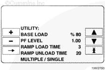 基本負載 (%) 控制發(fā)電機組與公用電網(wǎng)(干線)并聯(lián)運轉(zhuǎn)時的最大 kW 負載水平。顯示的數(shù)值表明發(fā)電機穩(wěn)態(tài)負載在發(fā)電機組備載規(guī)格中所占的百分比。在超出發(fā)電機組規(guī)格的負載水平下長期運行可能會造成發(fā)動機異常磨損或過早損壞。