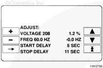 設(shè)置和調(diào)整子菜單允許標定圖形顯示器上的計量儀表,并可以調(diào)整系統(tǒng)參數(shù)和用戶定義的故障代碼、發(fā)電機組的電壓/頻率以及并聯(lián)應(yīng)用類型。設(shè)置和調(diào)整子菜單只能由合格的技術(shù)人員進行修改。