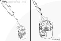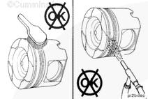 不要使用金屬刷。金屬刷會(huì)損壞活塞環(huán)槽。不要用玻璃噴丸清潔活塞環(huán)槽??墒褂昧慵?hào)為3822735的胡桃殼或塑料噴丸對(duì)活塞環(huán)槽和活塞頂進(jìn)行噴丸處理。用最小的有效壓力,并且不要長時(shí)間集中噴射一個(gè)區(qū)域。塑料噴丸的推薦工作壓力是276 kPa [40 psi]。