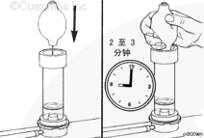 將橡皮球尖端插入測(cè)試儀的頂部孔中,擠壓橡皮球 2 到 3 分鐘,通過(guò)測(cè)試液吸出散熱器中的空氣。