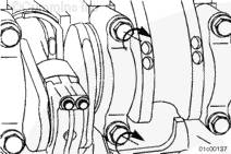 主軸承蓋上標(biāo)記有“V”字樣。使“V”標(biāo)記指向發(fā)動(dòng)機(jī)的前面。定位不正確會(huì)導(dǎo)致發(fā)動(dòng)機(jī)嚴(yán)重?fù)p壞。