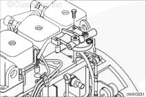 在康明斯發(fā)動機上安裝燃油濾清器座支架。在缸蓋上用手擰緊兩個 M10 螺栓,在缸體中用手擰緊剩余 M8 螺栓。