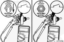 萬用表的一支表筆接觸開關(guān)的 RESUME/ACCEL(恢復(fù)/加速)端子。另一支表筆接觸底盤接地將該開關(guān)撥到 SET/COAST(設(shè)置/滑行)位置,然后再到 RESUME/ACCEL(恢復(fù)/加速)位置。測量電阻。