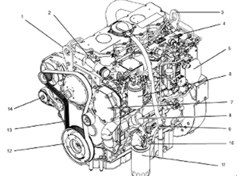 (1)前吊耳(2)出水口(3)后吊耳(4)燃油歧管(油軌)(5)電子控制模塊(6)燃細(xì)細(xì)濾器(7)水泵(8)機(jī)油加注口(9)機(jī)油表(10)機(jī)油取樣閥(11)機(jī)油濾清器(12)曲軸皮帶輪(13)傳動(dòng)皮帶(14)皮帶張緊裝置