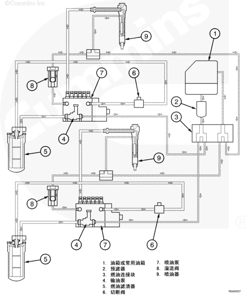 輸油泵 (4) 從客戶燃油箱或常用油箱 (1) 中抽出燃油。燃油通過康明斯或客戶預(yù)濾器 (2) 和燃油連接塊 (3) 循環(huán)。然后燃油流入輸油泵 (4),在輸油泵中增壓,并通過發(fā)動機上的燃油濾清器 (5) 循環(huán)。燃油流過燃油切斷閥 (6),然后流入噴油泵 (7),噴油泵使燃油達到噴油壓力并在適當?shù)臅r間將燃油輸送到每個噴油器 (9)。