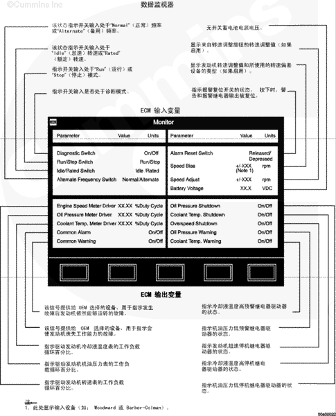 QST 發(fā)動機配備有發(fā)動機保護系統(tǒng)。該系統(tǒng)監(jiān)測關(guān)鍵的發(fā)動機轉(zhuǎn)速、溫度和壓力,并在高于或低于正常工作范圍時記錄故障診斷代碼。如果存在超范圍的情況,公共預(yù)警電路就會接通。操作者會得到 OEM 選擇設(shè)備的報警。當超范圍工作的情況越來越嚴重甚至造成發(fā)動機停機時,就會接通公共報警電路。