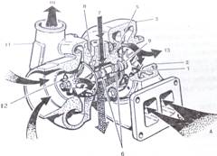 • 機器的排氣經(jīng)4進入,膨脹驅動渦輪機,給壓縮機提供動力,經(jīng)13排入大氣。燃燒的空氣經(jīng)過濾器從12進入壓縮機,經(jīng)10送至散熱器冷卻后送入機器。